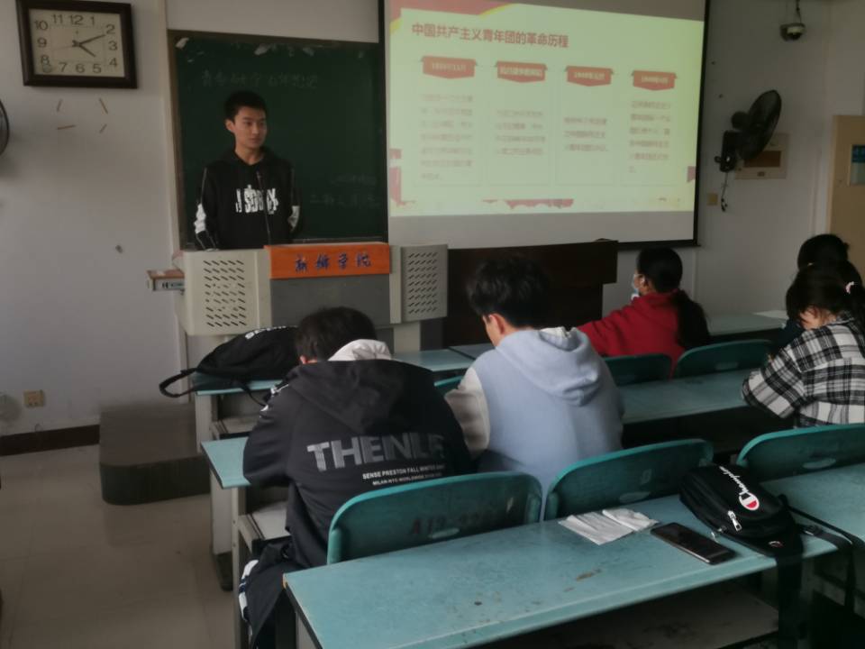 活动伊始,团支书徐文潇简述了共青团的发展历史,回顾了百年历程中一代代共青团员不怕困难,不畏艰险,在时代浪潮中不负历史之所托的青年风采。紧接着,宣传委员杨浩佳号召同学们在学习科学文化知识的同时,认清自己的历史使命,要继承无数团员革命先烈的遗志,为实现中华民族伟大复兴的中国梦作出新的贡献。随后,团支书徐文潇播放共青团成立以来的相关历史短片,让同学们更加了解共青团的历史。此次团日活动的最后,团支书徐文潇作为领誓人,带领全体同学重温入团誓词,表达了作为新时代青年砥砺奋进的坚定决心。